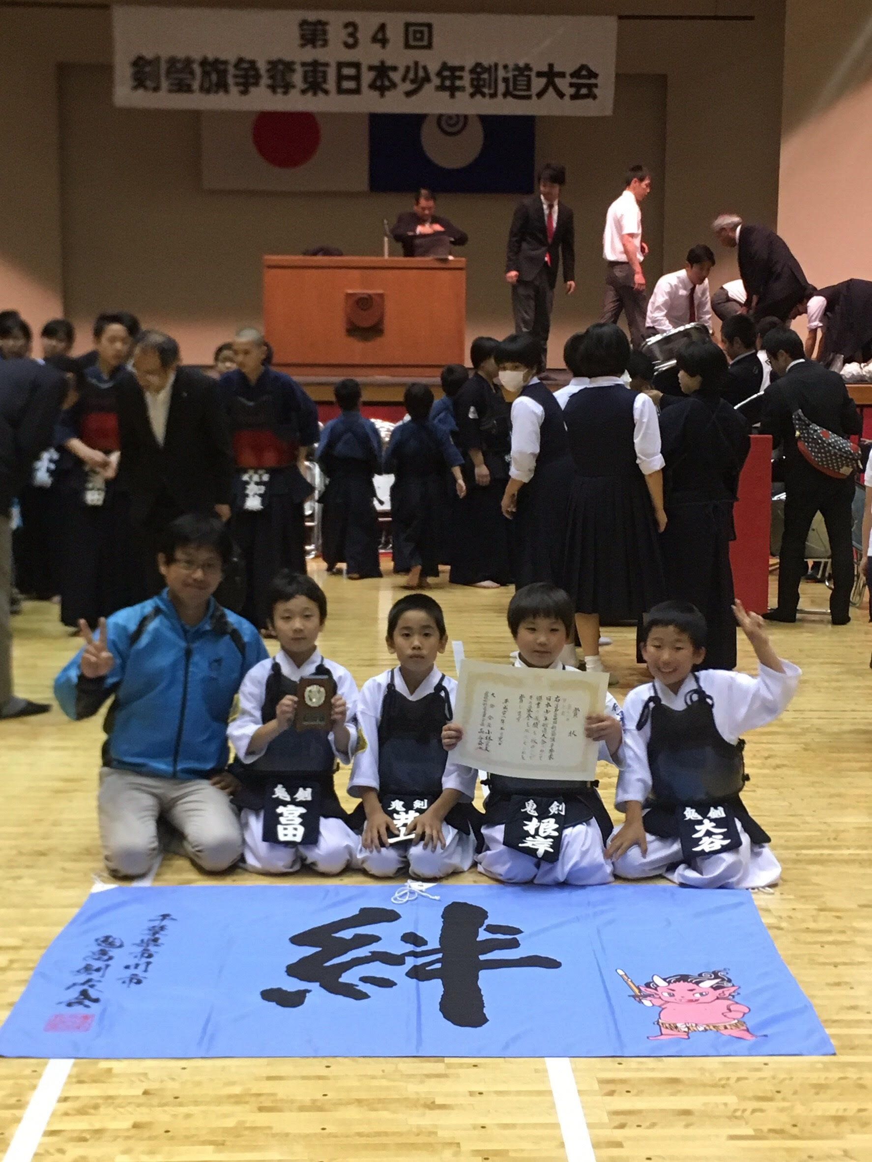 大会結果 (入賞履歴) 投稿日:2016.05.31 剣瑩旗争奪東日本少年剣道大会 日時:平成28年5月28日(土)場所:茨城県武道館団体戦低学年団体戦:努力賞!! 運動会や体調不良者も出て、4人での参戦となりましたが、元気よく頑張ってキッチリ賞状 盾をいただきました(^。^)次はベストメンバーで戦いたいね⁉︎高学年団体戦:第三位!!4月からなかなか結果を出せませんでしたが、ようやくチームが一つになって一戦一戦集中して試合に臨むことができ、強豪チームがひしめく本大会で、大きなメダルをいただくことができました。これから夏に向けて大会・錬成会が続きますが、また表彰台に立てるよう、頑張りましょう! 前に戻る
